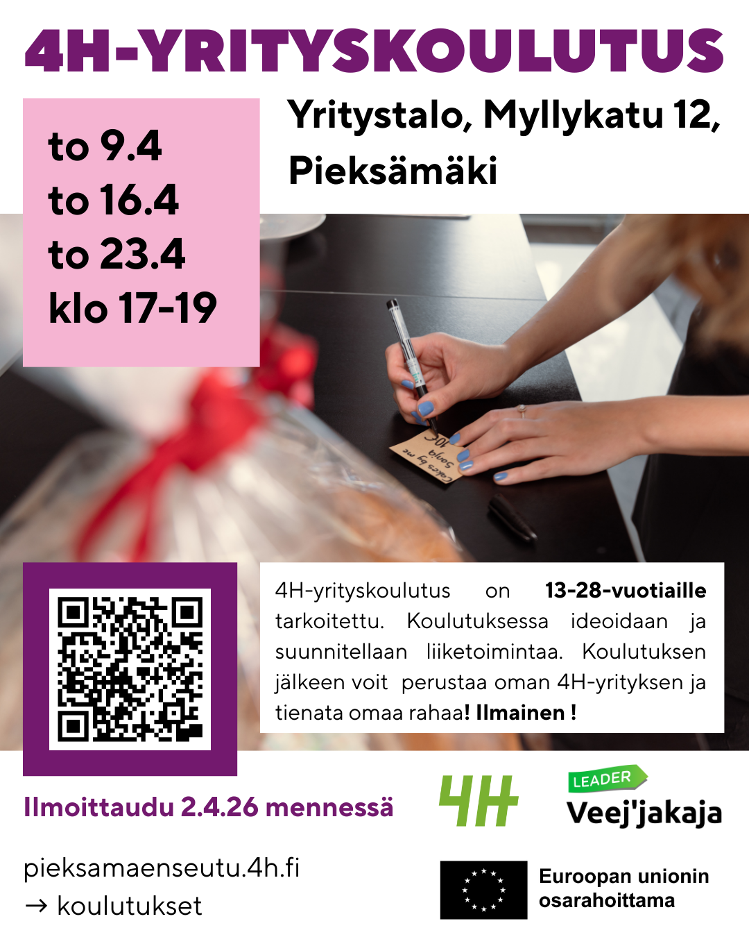 4H:n jäsenenä voit harrastaa, oppia uutta ja saada ystäviä! Pääset osallistumaan 4H-kerhoihin, leireille, tapahtumiin ja erilaisiin koulutuksiin ilmaiseksi tai edullisemmin ja saat niissä voimassa olevan tapaturmavakuutuksen. Voit myös työllistyä 4H:n kautta tai perustaa oman 4H-yrityksen 13-28 vuotiaana. Samalla tuet paikallista lapsi- ja nuorisotyötä!