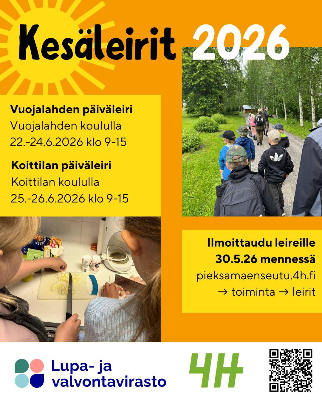 Vuolahden kesäleiri 22.-24.6.2026 klo 9-15. Leirimaksu 24 € sisältäen lounaan ja päiväjuoman, ohjelman ja vakuutuksen